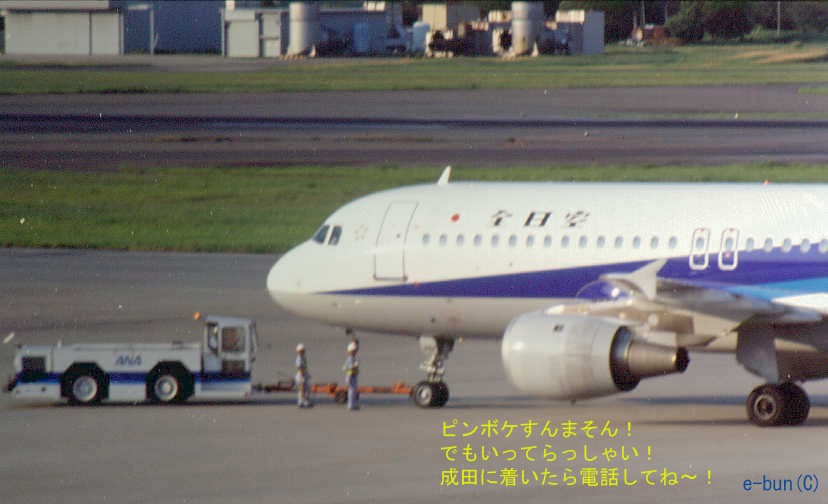 2000/08/12 17:15 ANA340 17:25発成田行き ※こんなもんかとピントをマニュアルで あわせて見たものの!BINGO! ボケボケやん! 300mmに2倍テレコンつけて狙って見た ものの意外と遠いのね.... しかもピントが合わせにくいんだよね EOS−KISSだからファインダーが 狭いし....悲しい。 でも、判ったよYAMA3だって... |